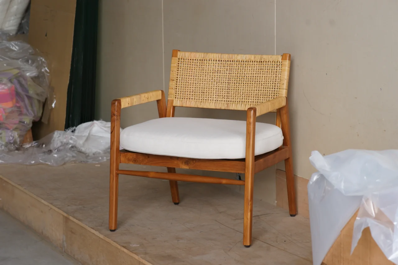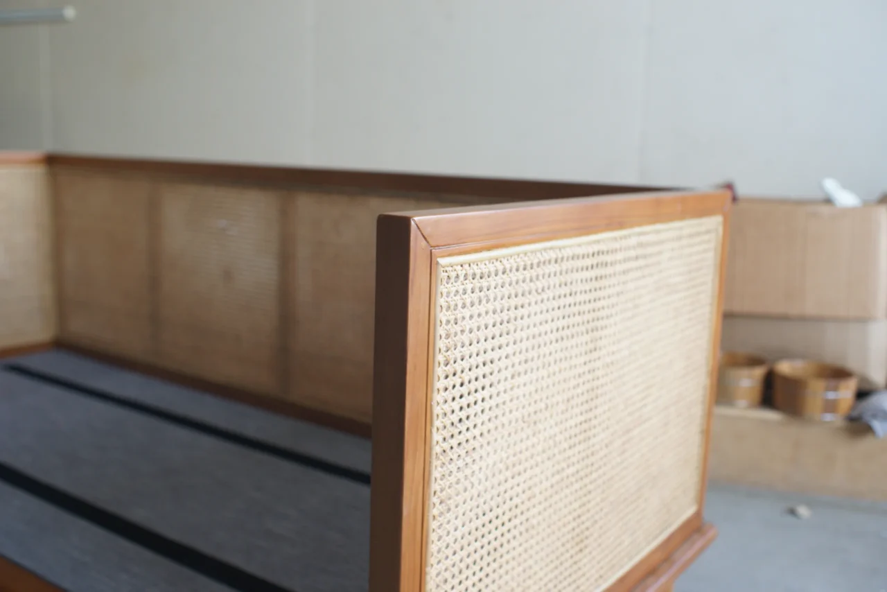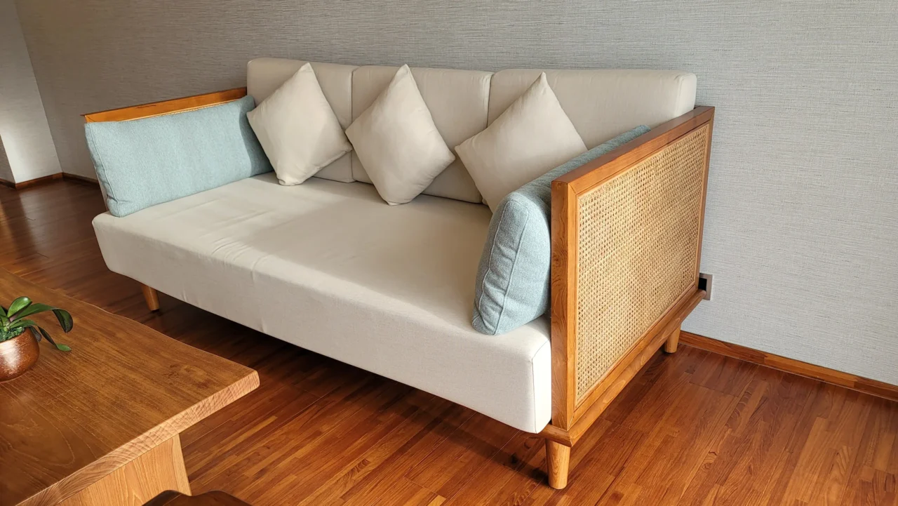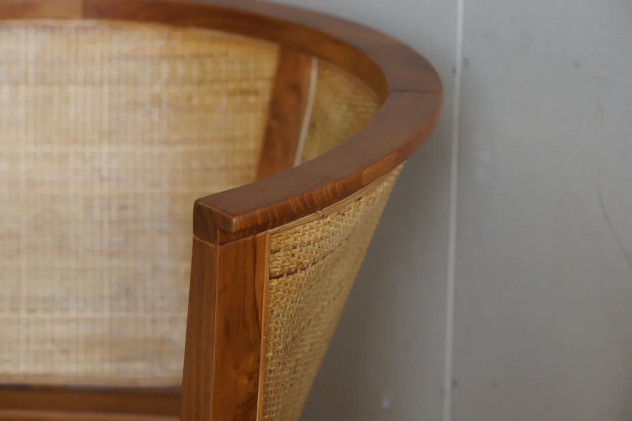 柚木的穩定與藤編的柔性,構成這張沙發獨特的「安靜氣質」