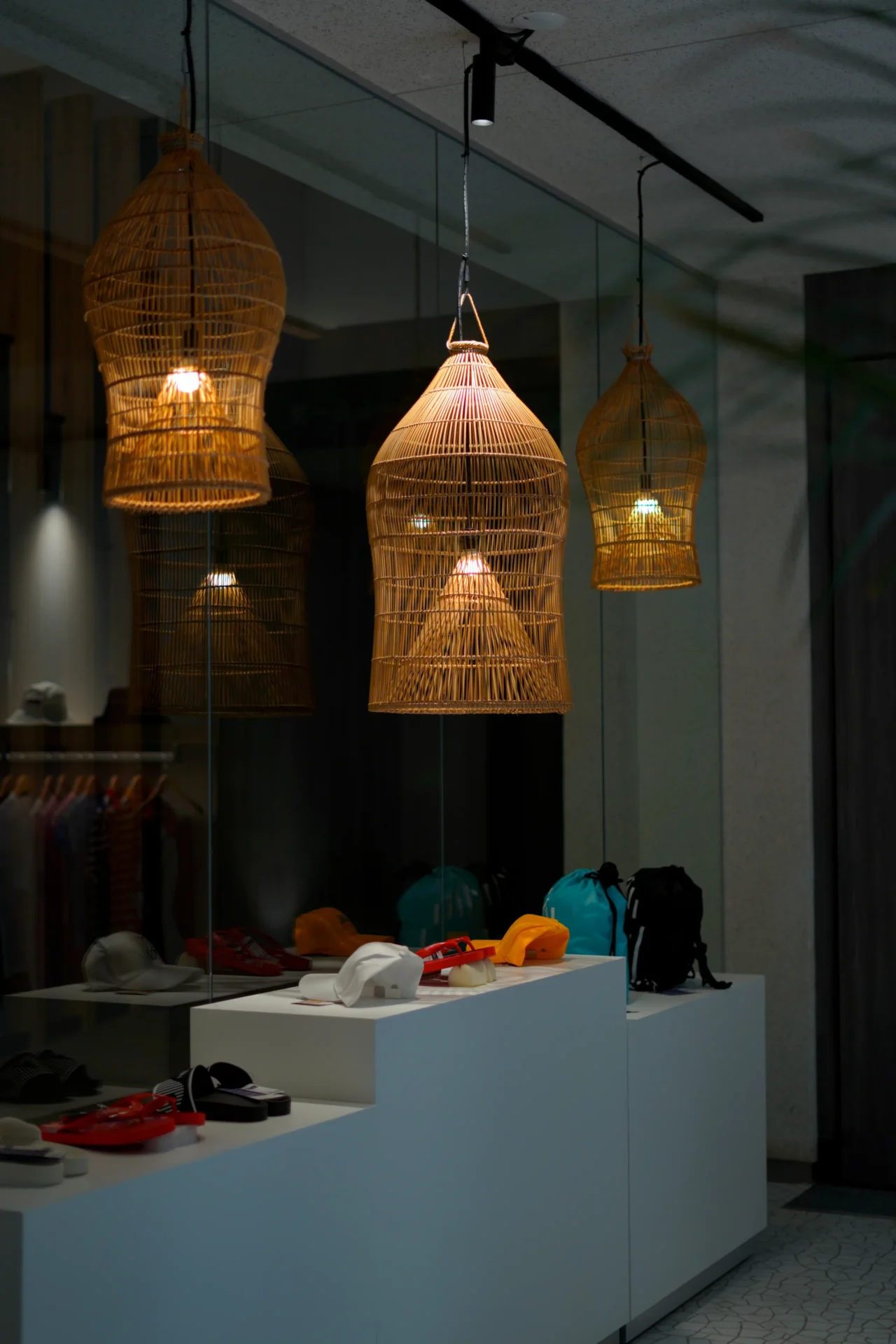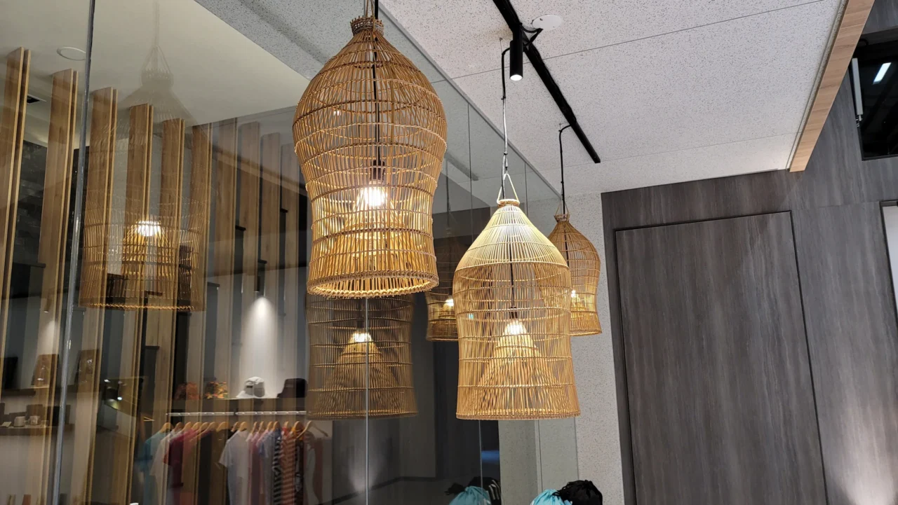 一籃籃手工製作的竹燈懸掛於挑高空間中,透過一條條紋理均勻的竹條,緩緩擺動著黃光