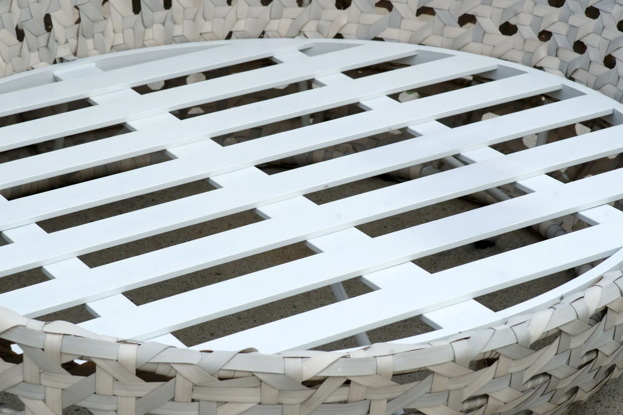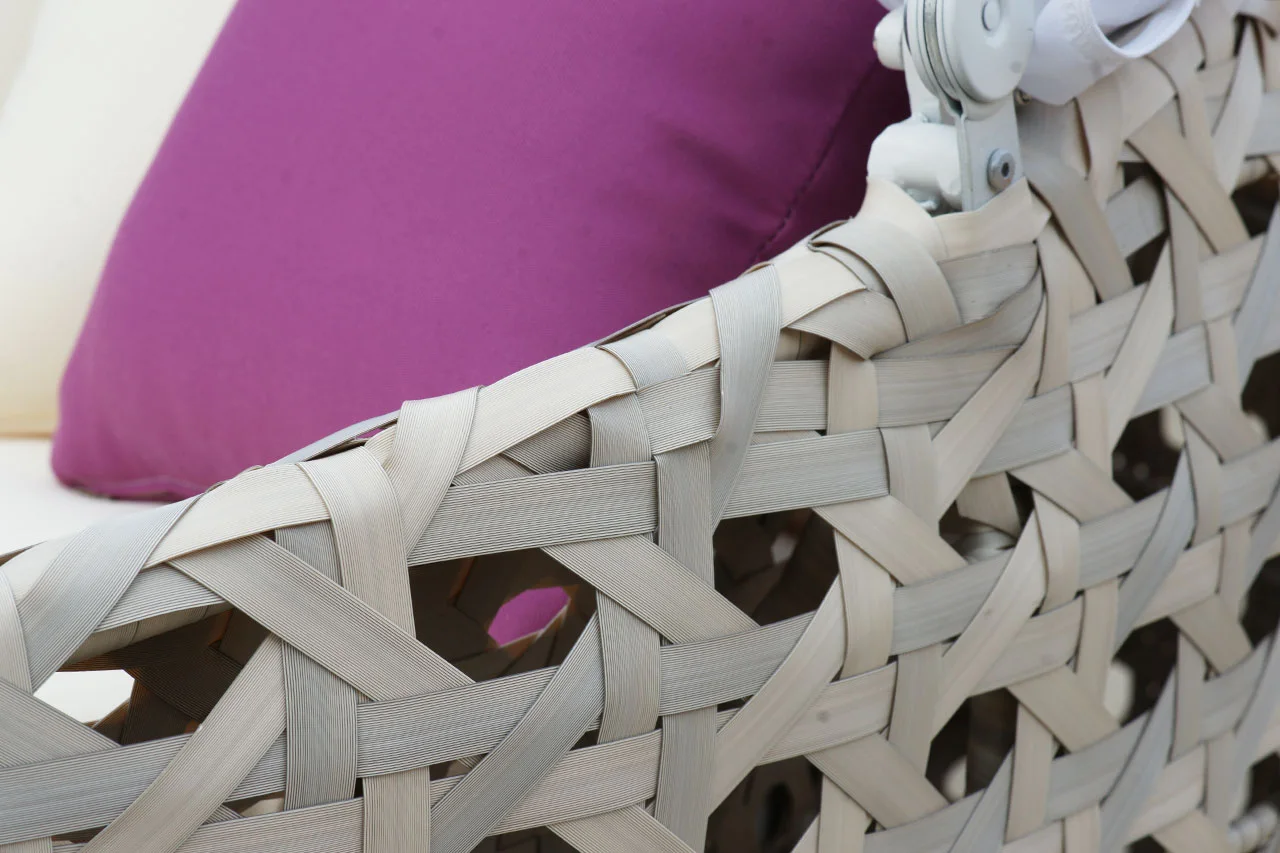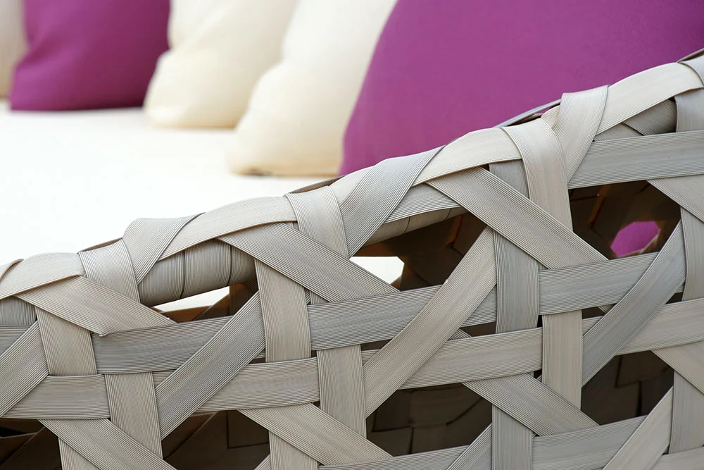 由聚乙烯高分子製成,模擬天然藤條的外觀,並具備優異的抗紫外線與防水特性,特別適合台灣潮濕氣候,可根據需求編織成各種設計,並提供多樣色彩客製選擇
