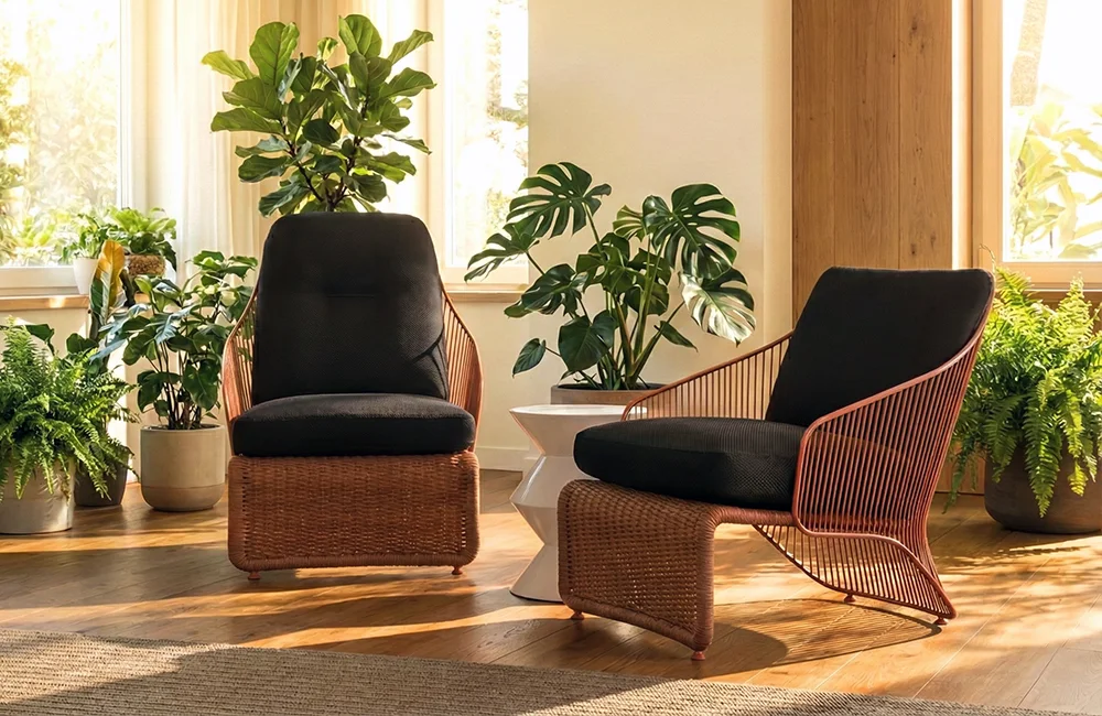 以溫暖的橘紅色調為基底,結合纖細的金屬骨架與厚實的織繩底座,勾勒出極具現代感的流線造型,為戶外空間注入活力與藝術氣息