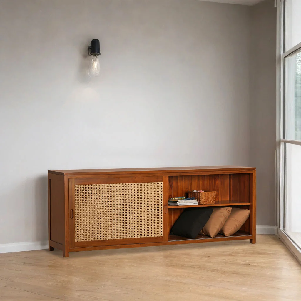 櫃門採天然藤編手工打造,紋理通透自然,搭配柚木厚實框架,將剛與柔完美融合,散發純粹的南洋休閒氣息
